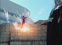 Broodwing fires a blast at Red, who dives off the side of a wall and fires back upon him sparkily. |