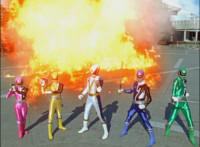 The five Rangers turn and pose with their weapons as the three aliens explode massively behind them. |