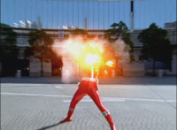 Energy slashed, a superimposed explosion erupts over A-Squad Megazord. |