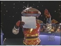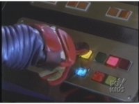 As Zordon talks, Alpha walks away from main console, clutching dome and wobbling a little, then leaning in on camera, lights flashing in front of him. |