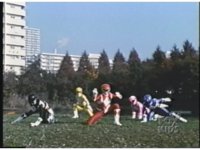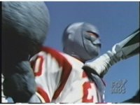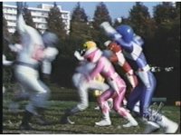 Side angle again of the Rangers, as they've just recovered from the first advance, the Bladehanded Football Putties dash back through them, sparkily slashing all five Rangers down as they pass. |