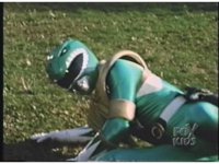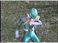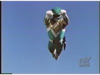 Close on the Green Ranger as he looks upward, then makes a right fist, looking down at it, before posing arms, then jumping up. |