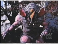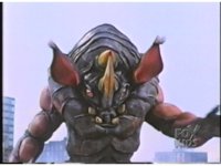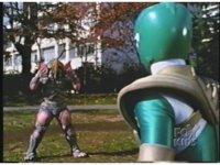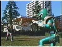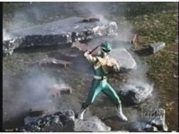 Rhinoblaster ducks under Green's kick, then blocks his arm when he tries to punch and hits back, then kicks at him, but the Ranger blocks. Green punches, but misses the monster, tries again, but Rhinoblaster grabs and holds his arm with both hands. |