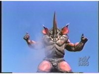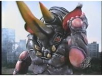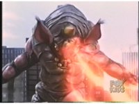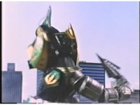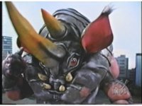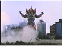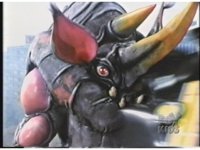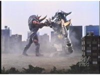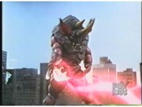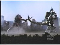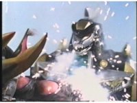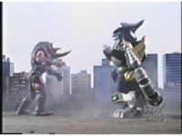 Sparkily slashed by the tail, Rhinoblaster is unfazed, then lunges forth, locking hand in hand with Dragonzord, before breaking free, then sparkily butting him in the chest with his horn. Dragon tries to hit as he passes, but the monster dodges, then kicks back, it's blocked, punches, but misses. Dragon whips tail around, Rhino ducks, then rushes up and sparkily butts into him again. |