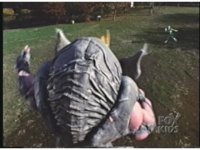 Close pan up from Dragonzord's stumbling-back feet, as he regains his bearings. |