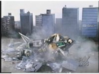 Sharp zoom in on Dragonzord, lying on its side and writhing amid the smoking ruins of a building. |