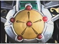 Extreme close-up on Dragonzord's chest plate as all five lights blink red. |