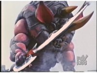 Zoom out from Rhinoblaster, as he lowers his sword, raises arms up, then motions sword to mouth, before firing reddish beam from it. |
