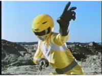 Yellow Ranger leaps up and poises arms to attack. |