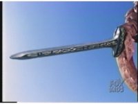 Close on Commander Crayfish holding out sword. |
