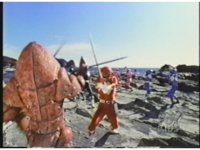 Close on Megazord blocking sword with left forearm, then pounding down the monster's hand, before sparkily bopping Commander Crayfish away. |