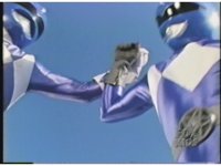 Skyward angle, of Blue Ranger's punch being blocked, Blue Mutant's punch being blocked, the Ranger's kneeing is blocked, the Mutant's kneeing is blocked, then the Ranger thrusts both arms out, blocking the Mutant's similar strike, before the Ranger suddenly jabs both fists into his gut, knocking him off. |