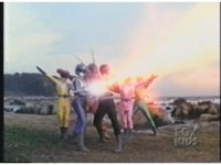 The Mutant Blaster fires its orange beam, as the Power Blaster fires its purple beam, both colliding between the two Ranger teams, until the superior firepower of the Power Blaster overtakes the Mutants', pushing back against them and erupting into a massive explosion. |