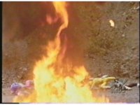 Ground level angle, as Commander Crayfish, and the Green, Blue, and Black Mutant Rangers collapse, before suddenly exploding massively, leaving nothing behind but a couple of raging wildfires. |