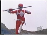 Red Ranger leaps up through the sky. |