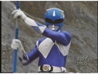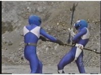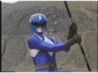 Blue Ranger backhands Blue Mutant, who blocks, grabs his arm, they switch positions, they break off, and the Ranger gut punches him. |