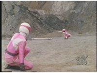 Pan up from the falling and rolling Blue Mutant, as the two Pinks handspring past each other, Pink Mutant kicking, Pink Ranger blocks, spinning punches, the Mutant ducks, the Ranger does a reverse roundhouse, the Mutant dives and rolls, then rises and blocks the Ranger's chop as shot zooms in. |