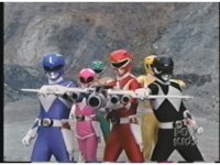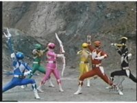 Red, Black, Blue, Yellow, and Pink Rangers flip over the camera under a sunny blue sky. |