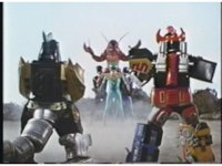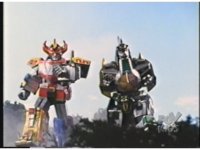 Camera tracks left as green electricity crackles about, and Dragonzord lowers onto the Titanus-based Megazord to make the MegaDragonzord, forming the completed Ultrazord. |