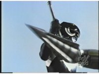 Red Ranger in cockpit, zoom in as he presses controls forth. |