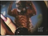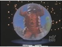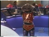 Distant shot near/behind Viewing Globe, as Alpha 5 watches it, jerking arms up and down while talking, then turns around to Zordon for a moment, then back to globe, talking and fretting, then turning back to Zordon once more. |