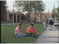 Courtyard of Angel Grove High School, two girls sit on the grass talking, while a guy and girl walk up the sidewalk. |