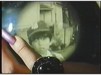Close on Rita, looking upward our right, making fist with right hand and giving a slight nod. She lowers fist and a wide smile comes over her face. |