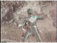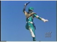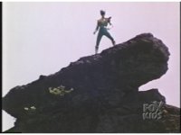 Atop a far rock formation, Green Ranger stands for a moment, then runs down to the left and hops down from the back end. |