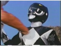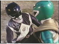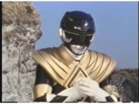Black Ranger raises both fists up, then motions arms so that he points two fingers on each hand to his forehead as shot zooms into extreme close-up of his helmeted face. |