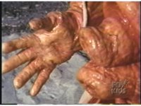 Close-up on Oysterizer's left hand as he wiggles fingers a little then spreads hand out. |