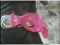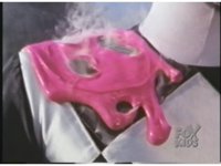Close-up on blob of pink goop, smoking atop Black's right gloved hand. |