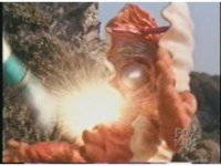 Close on Oysterizer as he gets slashed by diagonal energy beam, zoom out as he writhes, then explodes with sparks and ring pulsing, red electricity erupting as he finally falls. Upon hitting the ground, he flares with a blue light, that releases a massive explosion, getting shucked right on the sea shore. |
