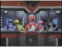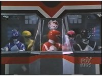Zoom out from Red, as all five Rangers in cockpit raise right arms and make slashing downward motion. |