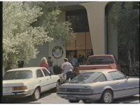 Exterior of Youth Center, blue car pulls in beside red truck, as skateboarder gets off his board, blonde in pink top approaches ball tosser, and crowd enters front door. |