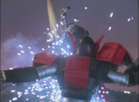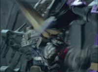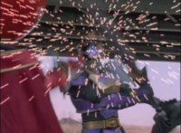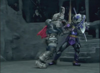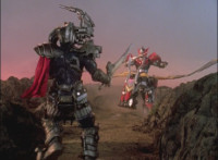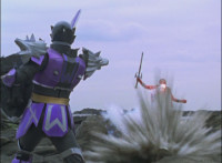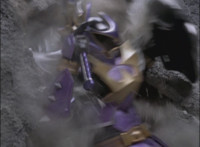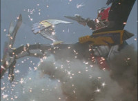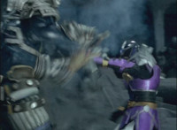 Morticon marches over and clashes blades sparkily with Mystic Phoenix, then knocking Phoenix's saber out of his hand, before slashing and missing, but then backhanding Phoenix sparkily. Morticon grabs the Dragon by the neck, and flings it and Mystic Phoenix into the air, flipping them over in front of Centuarus Wolf Megazord. |