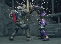 Morticon sparkily slashes his sword against Koragg's shield, repeatedly, Koragg also ducking under a few slashes, pacing backwards as Morticon presses on him, soon locking sword to shield and shoving him into reverse. |