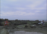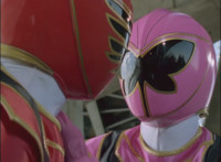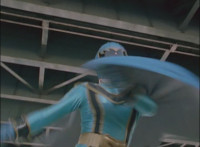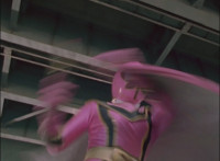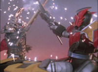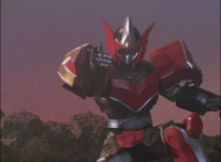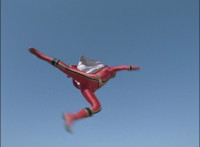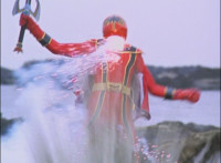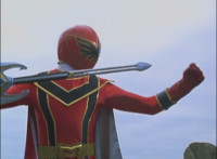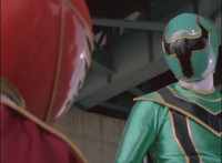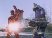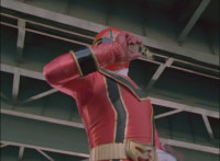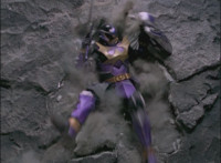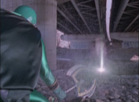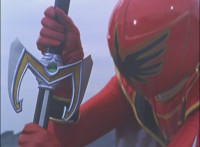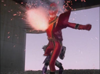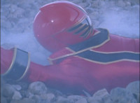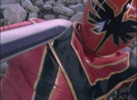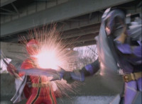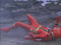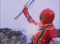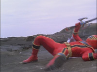 Red spark bursts as he falls over, Koragg then approaching and pointing his sword at him for a moment, then reeling his blade back and beginning to stab it forth at his downed opponent, when a burst of energy strikes his hand, turning his attention to the other four Rangers, racing onto the scene. Green leaps up and slams his Axe down on the ground, sending a ripple quake across the river and into Koragg explosively. Red rolls over to his teammates, the gals checking on him first. Green talks to him, as does Pink, Yellow says a few things before slapping him on the helmet, and finally Blue speaks to Red. Replying, Red gets up and excitedly talks to his teammates, when Koragg returns to face them. He speaks to them under the bridge. |
