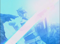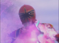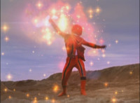 Red finishes standing up and screaming at Koragg, before firing up his body with sparkle energy, Koragg watching, as he charges up his saber and throws the energy forth. |