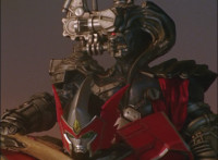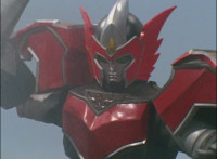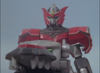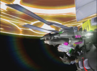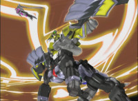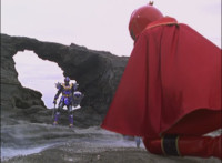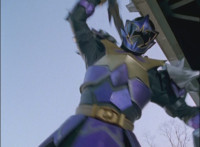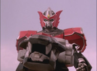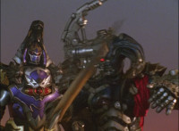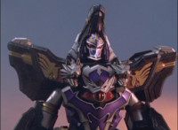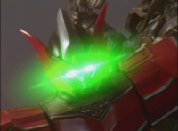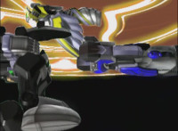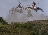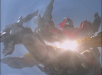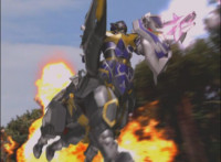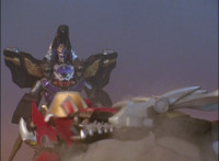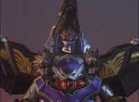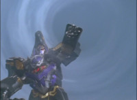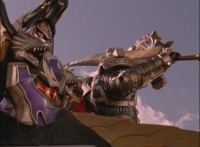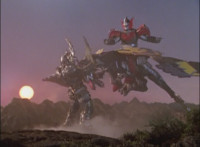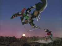 Catastros charges through an energy tunnel, shifts his head back, as Koragg hovers in and connects with his body, forming Centaur Megazord. |