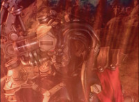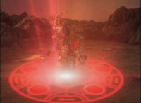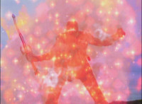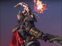Morticon talks again, and prepares to stab Mystic Phoenix, when his eyes light up, and his body charges with red sparkled energy, taking Morticon aback long enough to allow Phoenix to get up, and flip up into the sky, Centaurus Wolf looking upward. |