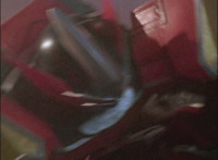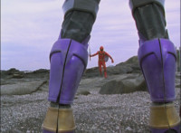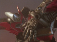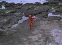Cuts two shots prior of Koragg slashing Red; cuts two shots of Koragg talking to Red at sword-point between shots 2 & 3; cuts shot of Red leaping out of the way between shots 10 & 11; cuts follow-ups of Rangers standing ready and Koragg sliding his sword back into his shield. |
