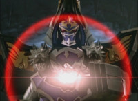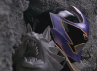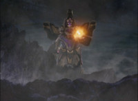 In a purple flash, Centaurus Wolf Megazord lands in the Underworld. It stands with a glowing ball of gold energy in hand, admiring it, before putting it in its chest and walking off, just as Necrolai swoops in and hovers there, talking to herself. |