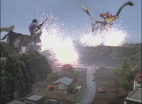 Burst erupt in the air around Mystic Dragon as Mystic Phoenix pilots it into successfully avoiding getting hit. |