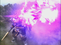 Centaur Megazord fires energy wolves at Mystic Dragon as it spews three streams of flames all about, sparks erupting on the ground below as it slowly approaches the stationary object. |
