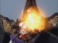 Centaurus Wolf Megazord touches its glowing chest, then raises its left hand skyward and sends a ripple up to Mystic Phoenix, which overwhelmes him to the point he lands Mystic Dragon, and a glowing ball of energy pulls out of his chest into Centaurus Wolf's hand. Mystic Phoenix tries to figure out why the Dragon won't fly, then Centuarus Wolf holds up a ball of golden energy, taunting Phoenix. |