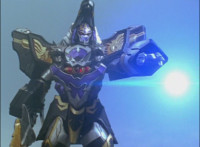 Centaur Megazord lands on the ground, then Koragg aims his shield up and fires energy wolves. |