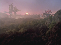 Zoom out from Mystic Phoenix on Mystic Dragon, the sun setting in the background, as Morticon begins to walk forth. |