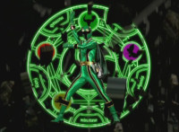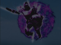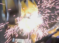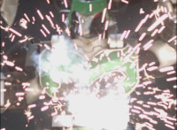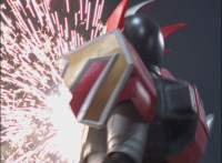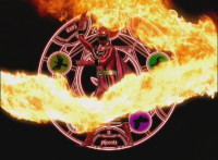 Koragg stands still, as Mystic Garuda & Mystic Phoenix strike at him at once, prompting him to block both, smacking Phoenix's saber aside, then sparkily slashing Garuda, doing the same to Phoenix, then locking blades with him, allowing Mystic Mermaid to leap in and strike with her weapon. Koragg notices in time to sparkily break off from Phoenix, then sword slash Mermaid sparkily twice, knocking her down. Mystic Minotaur steps in and smashes his axe down at Koragg, who shield blocks it for a spark-grinding moment or two, then breaks off, sparkily slashes Minotaur away, then reengages with Phoenix, sparkily slashing him twice. Garuda watches, then spots Mystic Sprite in soccer ball form flying onto the scene. |