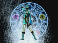 Each of the five Mystic Rangers pose in front of their colored seal with element activity, then close-ups of their belt and Magi Staff toppers, and finally a pose in front of their elemental event, with a shimmering of their visors to end it. |