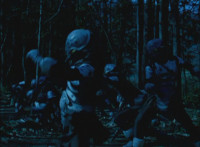 Sharp zoom out from Hidiacs emerging from the bushes in the forest. |